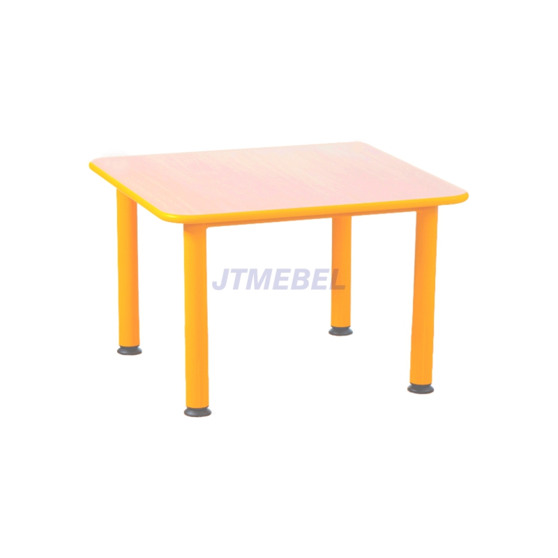 Kwadratowy blat o wymiarach 70 × 70 cm wykonany jest z trwałej płyty laminowanej z zaokrąglonymi rogami i obrzeżem zabezpieczonym profilem półokrągłym T, co zwiększa bezpieczeństwo dzieci podczas użytkowania. Stelaż wykonany jest z rury stalowej Ø 50 mm, zapewnia stabilność i wytrzymałość konstrukcji.