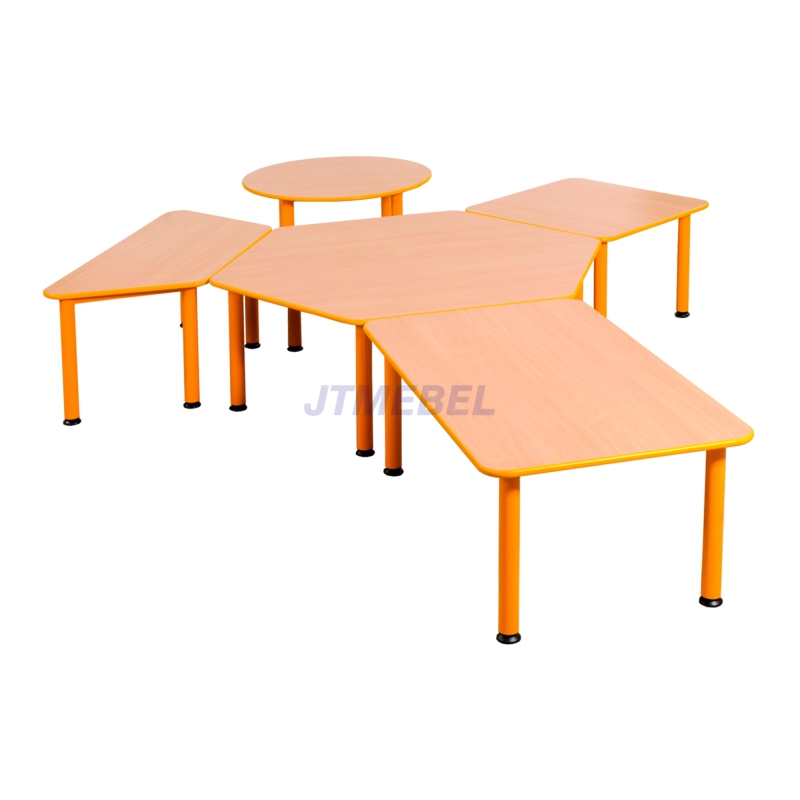 Stół dostępny w różnych rozmiarach wysokości dopasowanych do wieku dziecka oraz w szerokiej gamie kolorów blatu i stelaża, co pozwala dopasować go do wystroju sal przedszkolnych i świetlic.